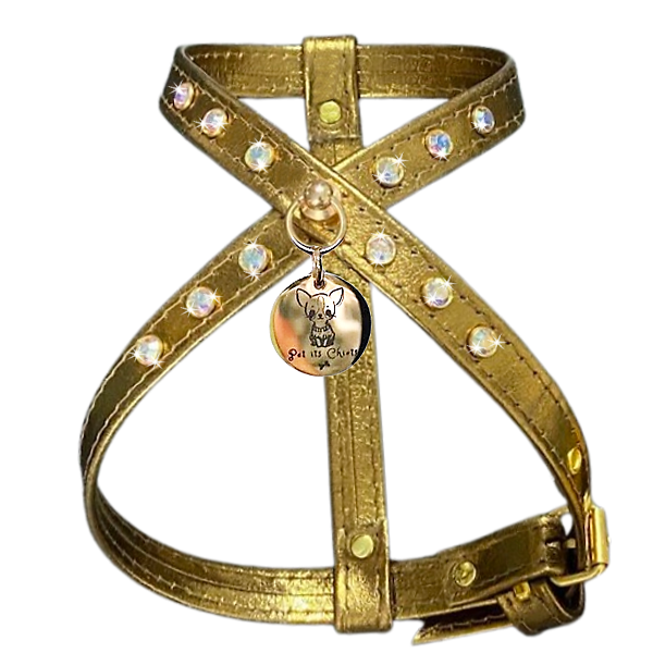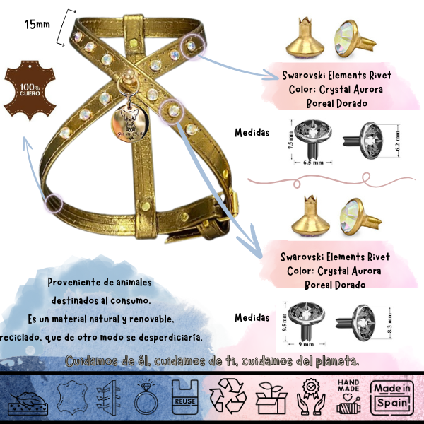 Exquisito arnés de cuero genuino color oro viejo y rivet Swarovski. La línea PawRocks, concebida para brillar ostentosamente, no solo realza la belleza de tu pequeño, hace una declaración de estilo incomparable convirtiéndolo en la esencia del glamour en cada paseo.