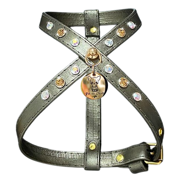 Exquisito arnés de cuero genuino color plata vieja y remaches Swarovski. La línea PawRocks, concebida para brillar ostentosamente, no solo realza la belleza de tu pequeño, hace una declaración de estilo incomparable convirtiéndolo en la esencia del glamour en cada paseo.