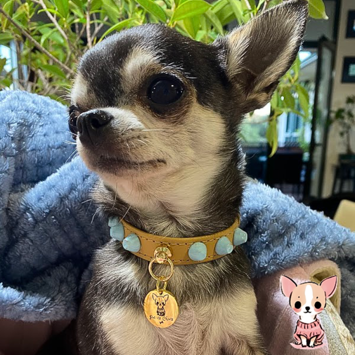 Simpático collar de cuero genuino color camel con apliques en azul bebé. Porque un "Toy" No es ningún juguete, aquí disponemos del diseño ideal para los más atrevidos sin renunciar a la elegancia y comodidad. ¡Pequeño Malote! Ésta es tu opción más Chic.