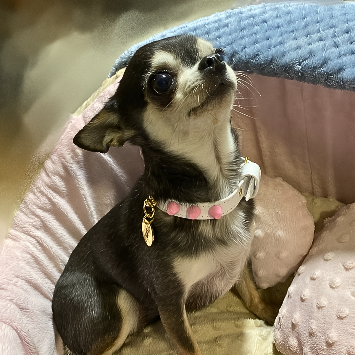 Simpático collar de cuero genuino color blanco con apliques en rosa bebé. Porque un "Toy" No es ningún juguete, aquí disponemos del diseño ideal para los más atrevidos sin renunciar a la elegancia y comodidad. ¡Pequeño Malote! Ésta es tu opción más Chic.