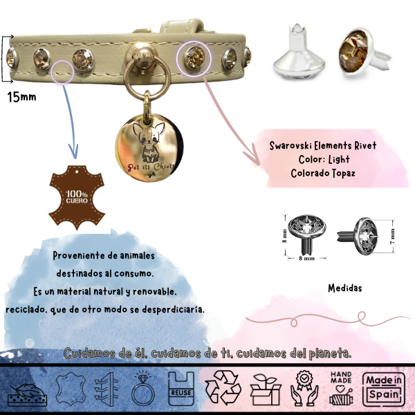 Exquisito collar de cuero genuino color beige y rivet Swarovski. La línea PawRocks, concebida para brillar ostentosamente, no solo realza la belleza de tu pequeño, hace una declaración de estilo incomparable convirtiéndolo en la esencia del glamour en cada paseo.