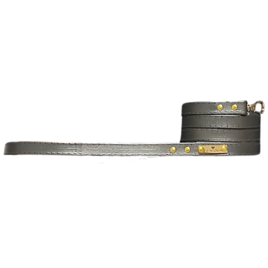 Imprescindible correa de cuero genuino, color plata vieja. Sencilla, cómoda y elegante para estar impecable en cualquier momento y ocasión. Combínalos con tu collar o arnés favorito.